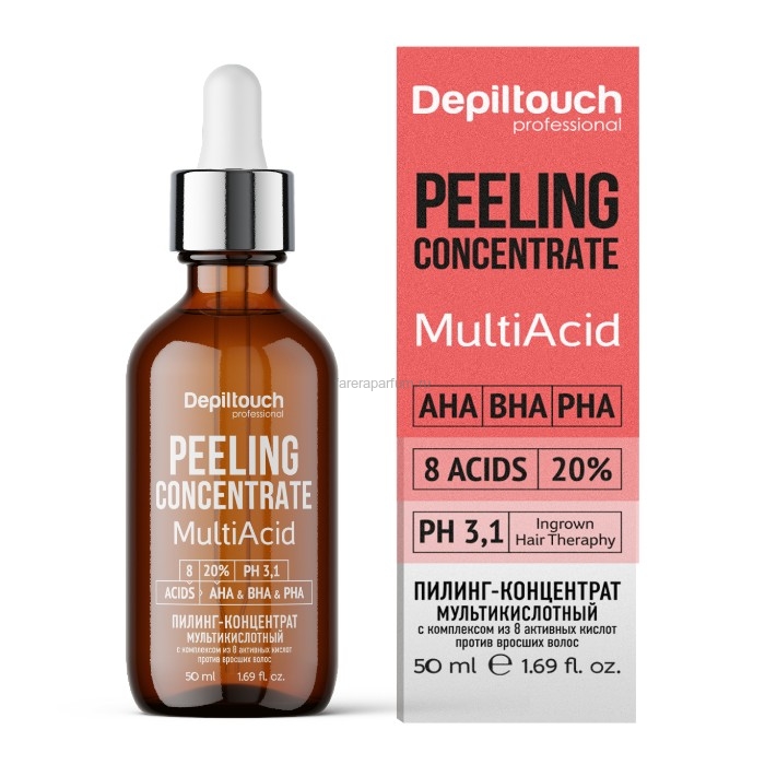 Мультикислотный пилинг-концентрат борется с гиперкератозом, проблемой вросших волос, комедонами, пятнами постакне и при фолликулите, а также способствует выравниванию микрорельефа кожи и ее мягкому осветлению, подходит для обработки мелких микросинячков после вытаскивания вросших волос пинцетом. В составе пилинга комплексная триадная группа кислот (20%) разных типов (AHA+BHA+PHA), имеет рН = 3,1, может применяться как в домашних условиях, так и в салонах. Средство не содержит спирта, красителей и подходит для всех зон, включая лицо, чувствительные области бикини и подмышек.